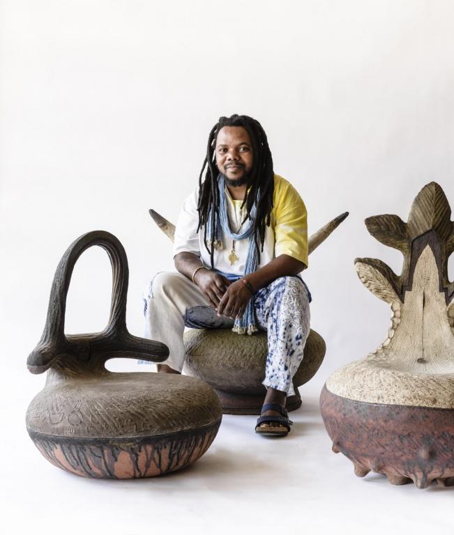 Andile Dyalvane’nin el yapımı kapları, lambaları, masaları ve çeşitli eşyalardan oluşan çalışmaları, sanatçının Cape Town’daki yaşantısının, Doğu Cape’de büyürken edindiği tecrübelerin ve atalarının geleneklerinin birer yansıması… Amerika’daki ilk solo çalışması New York Friedman Benda Sanat Galerisi’ndeki “Camagu” isimli gösterisiydi. Camagu, sanatçının çalışmasının da merkez aldığı ve “Minnetarım” anlamına gelen bir Xhosa mantrası. Dyalvane’nin çalışmaları, ilhamını deriye kazınan Xhosa sembollerinden alan detaylı şekiller ve renklere aracılığıyla toprak, hava, ateş ve su elementlerinin tümünü kucaklıyor. Dyalvane’nin bir diğer sanatçı dostu Zizipho Poswa’yla beraber Cape Town’da açtığı Imiso Ceramics isimli galeri-stüdyoyu takip etmenizi tavsiye ederiz.